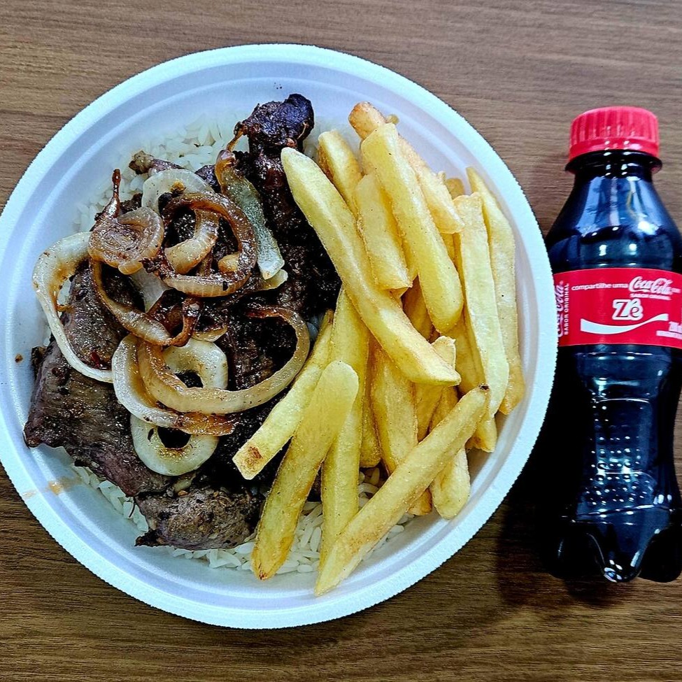 Contrafilé Acebolado acompanhado de arroz, feijão carioca e batata frita crocante + Coca pet Original
