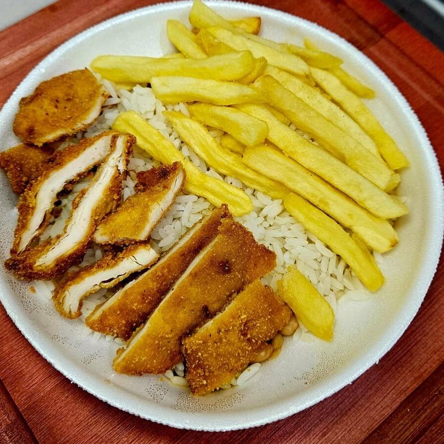Frango empanado em iscas acompanhado de arroz, feijão carioca e batata frita crocante