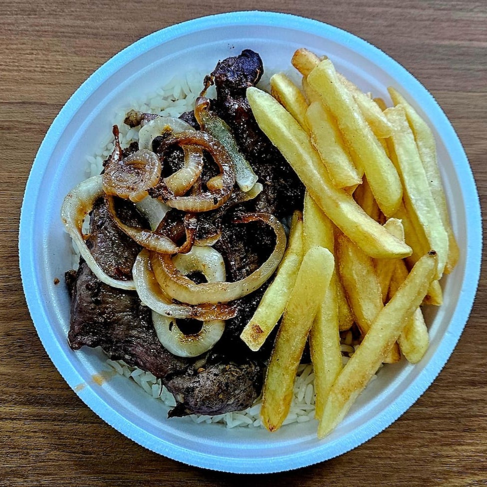 Contrafilé Acebolado acompanhado de arroz, feijão carioca e batata frita crocante