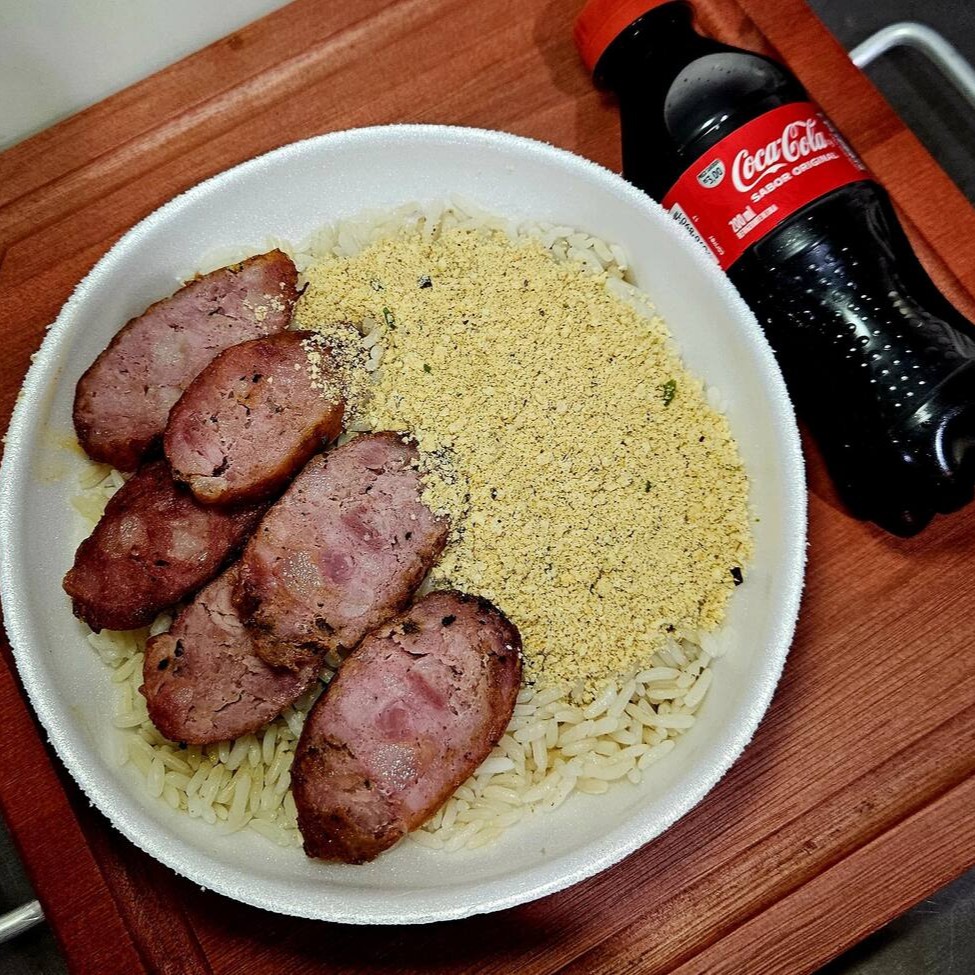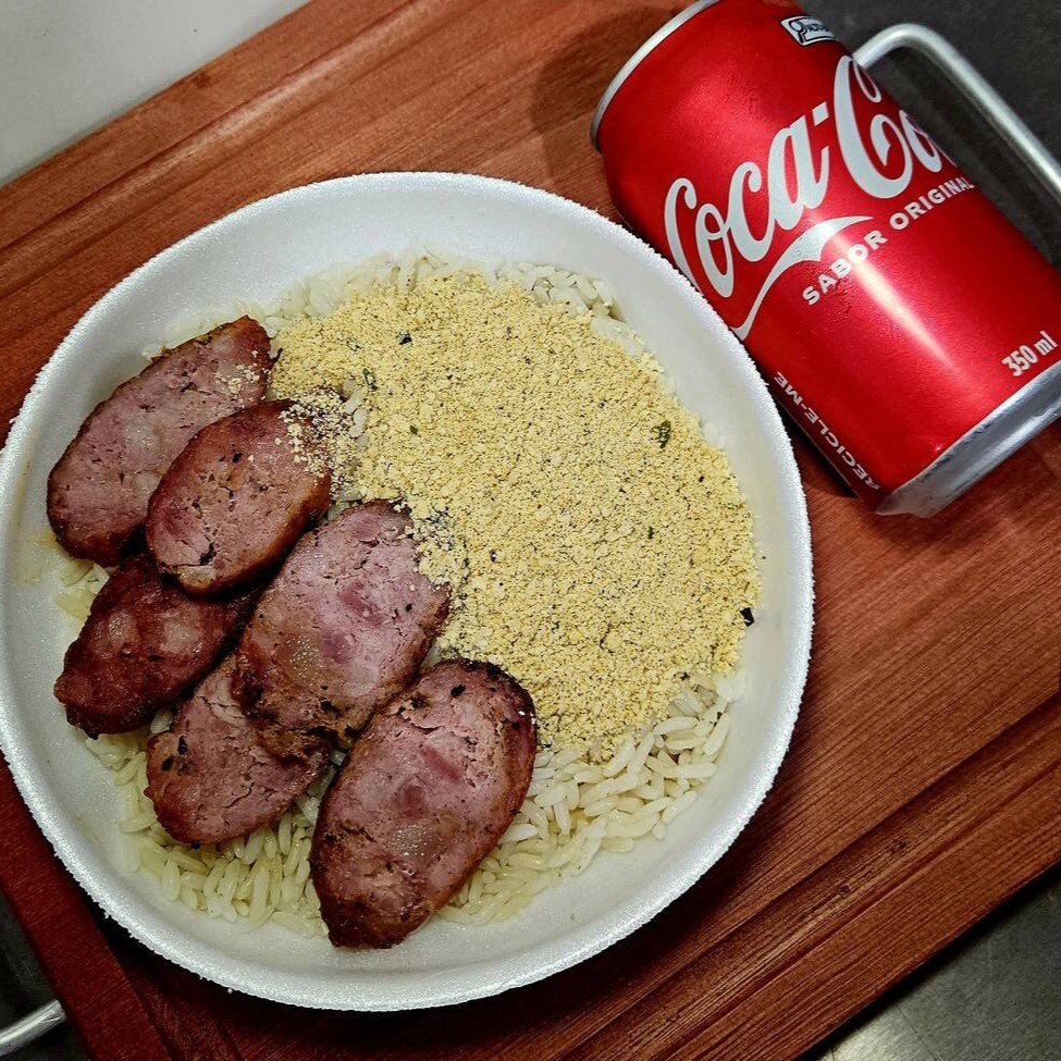 Linguiça de Churrasco tipo toscana acompanhada de arroz, feijão carioca, farofa temperada + coca pet Original