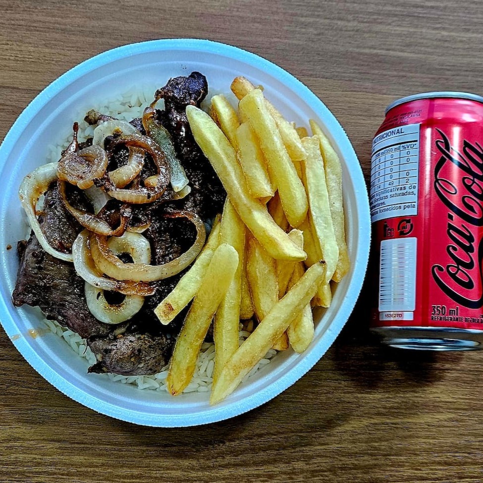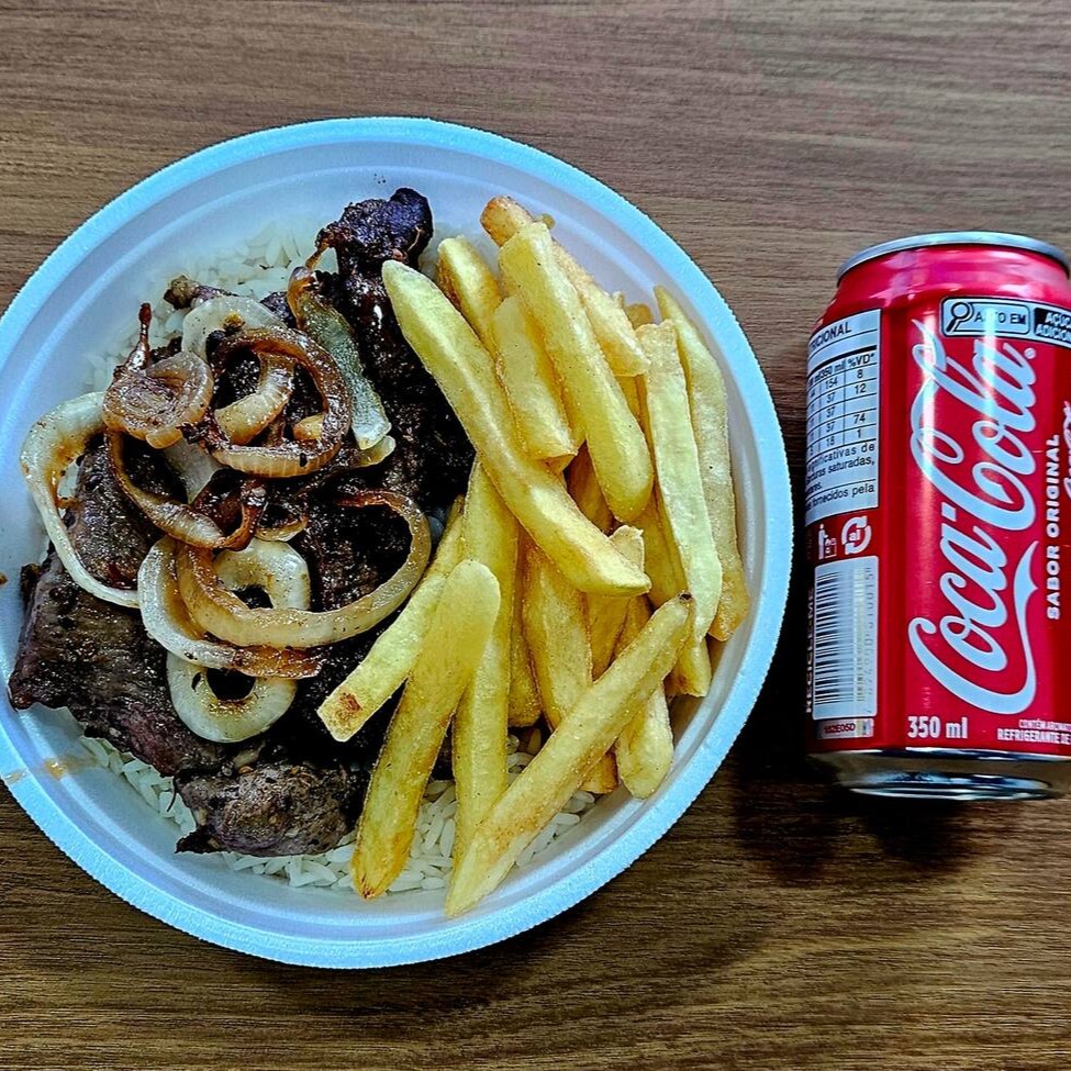 Contrafilé Acebolado acompanhado de arroz, feijão carioca e batata frita crocante + Coca lata zero