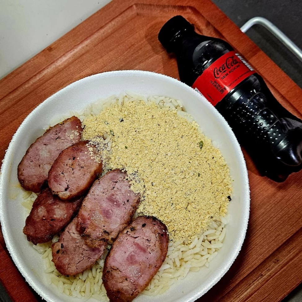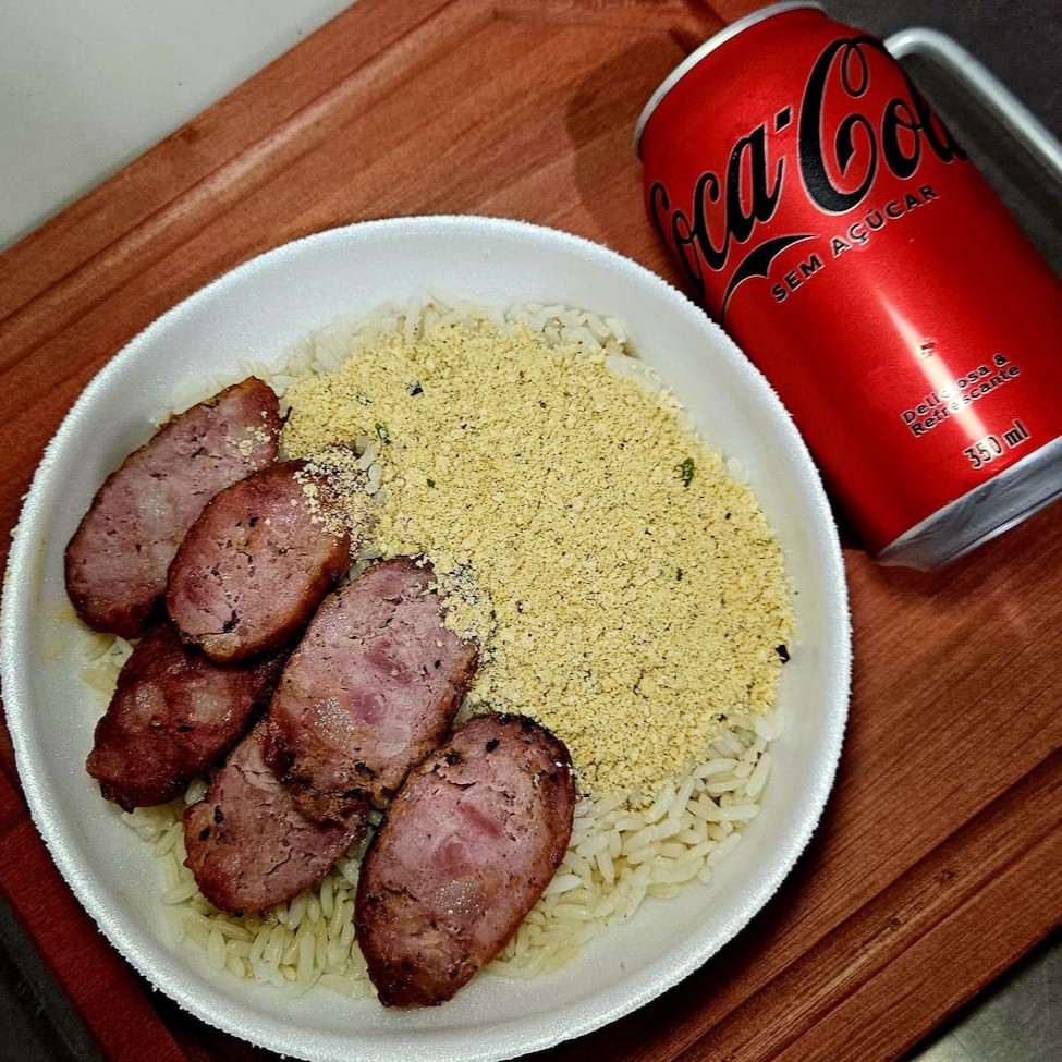 Linguiça de Churrasco tipo toscana acompanhada de arroz, feijão carioca, farofa temperada + coca pet zero