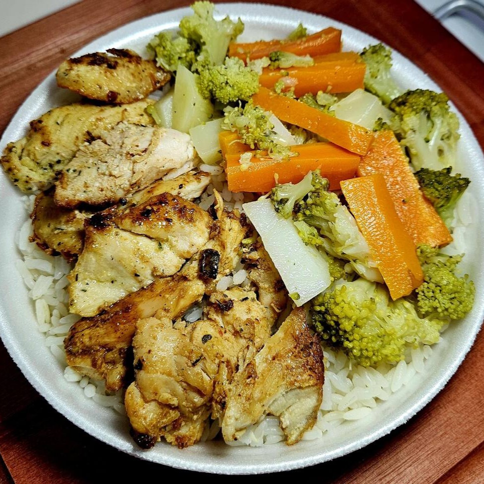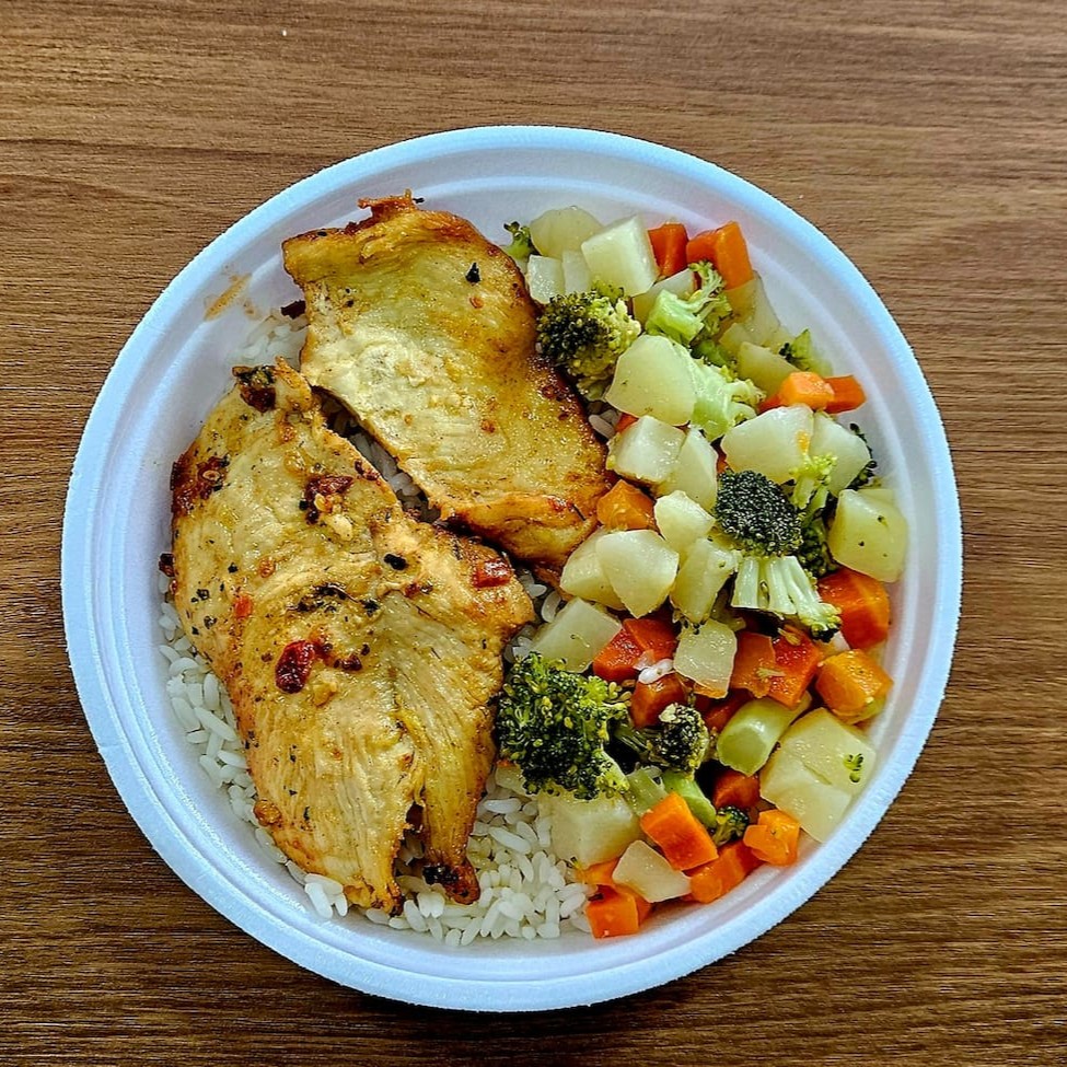 Filé de Frango Grelhado e Mix de Legumes Acompanha arroz, filé grelhado e mix de legumes (este prato não acompanha feijão)