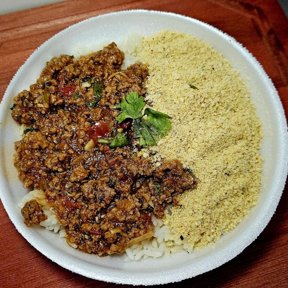 Carne Moída com farofa temperada acompanhada de arroz e feijão carioca
