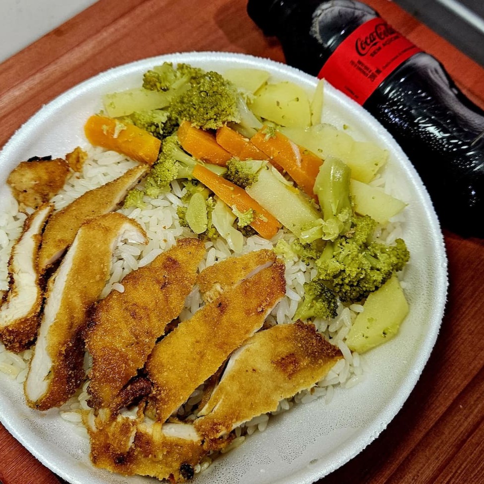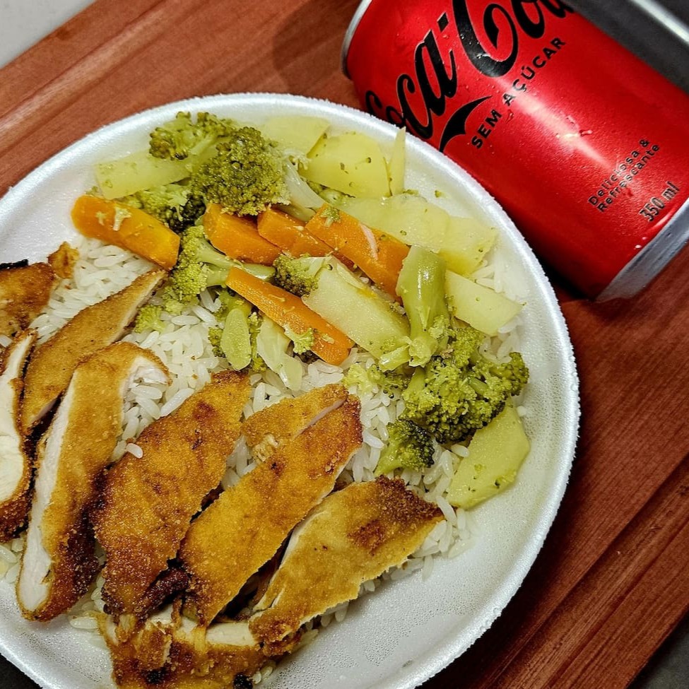 Frango Empanado em iscas acompanhado de arroz, feijão carioca e mix de legumes + coca pet zero