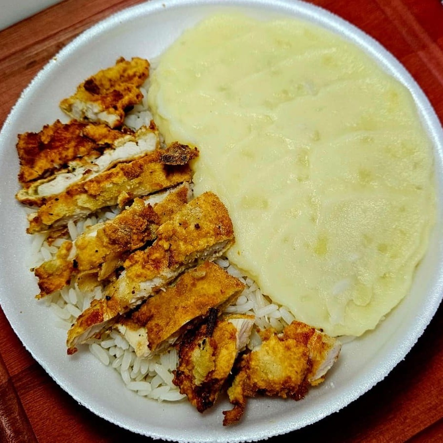 Frango empanado em iscas acompanhado de arroz, feijão carioca e purê de batatas cremoso