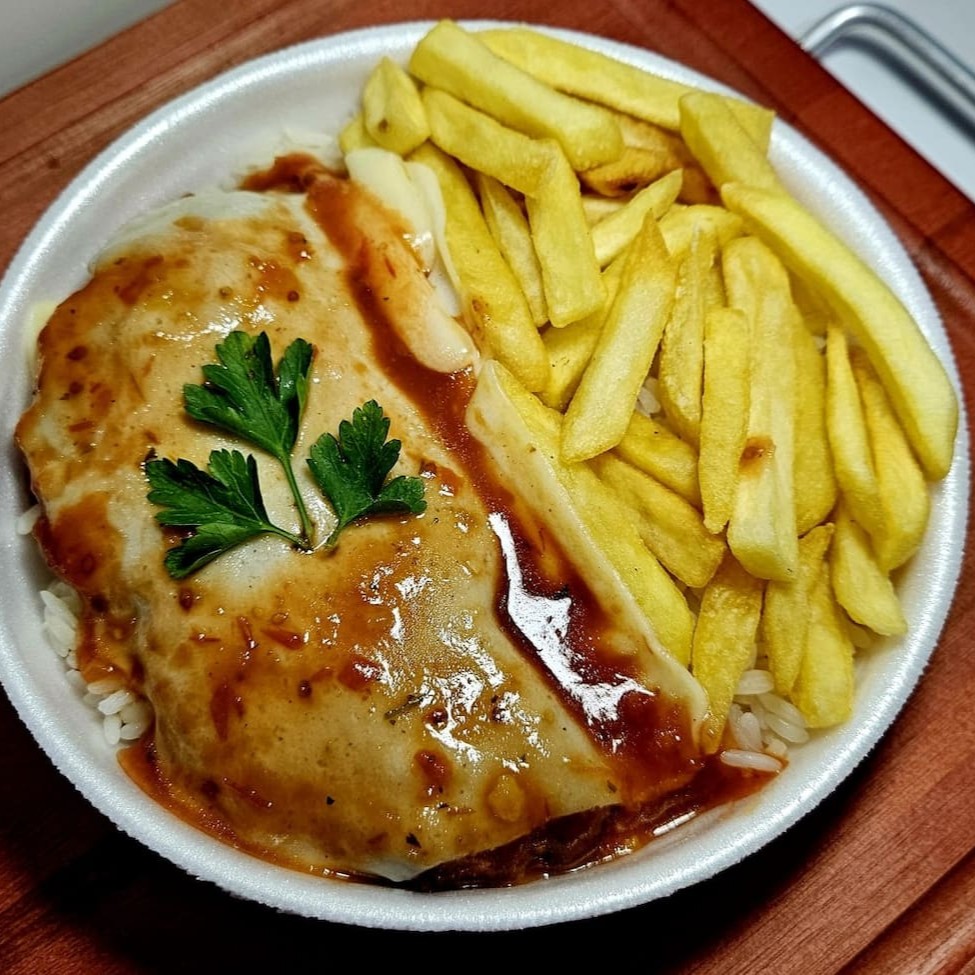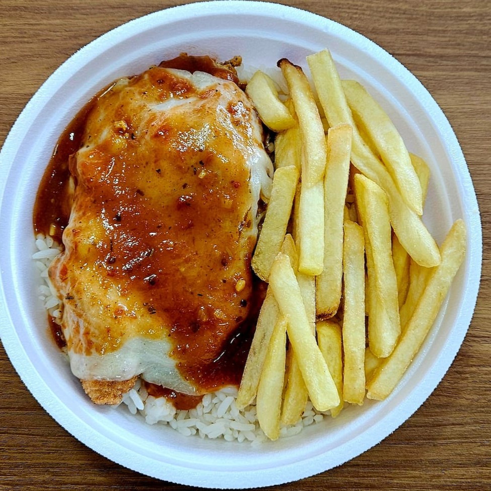 Marmita de parmegiana de Frango com fritas e arroz. Não acompanha feijão. Temos opção no extra.