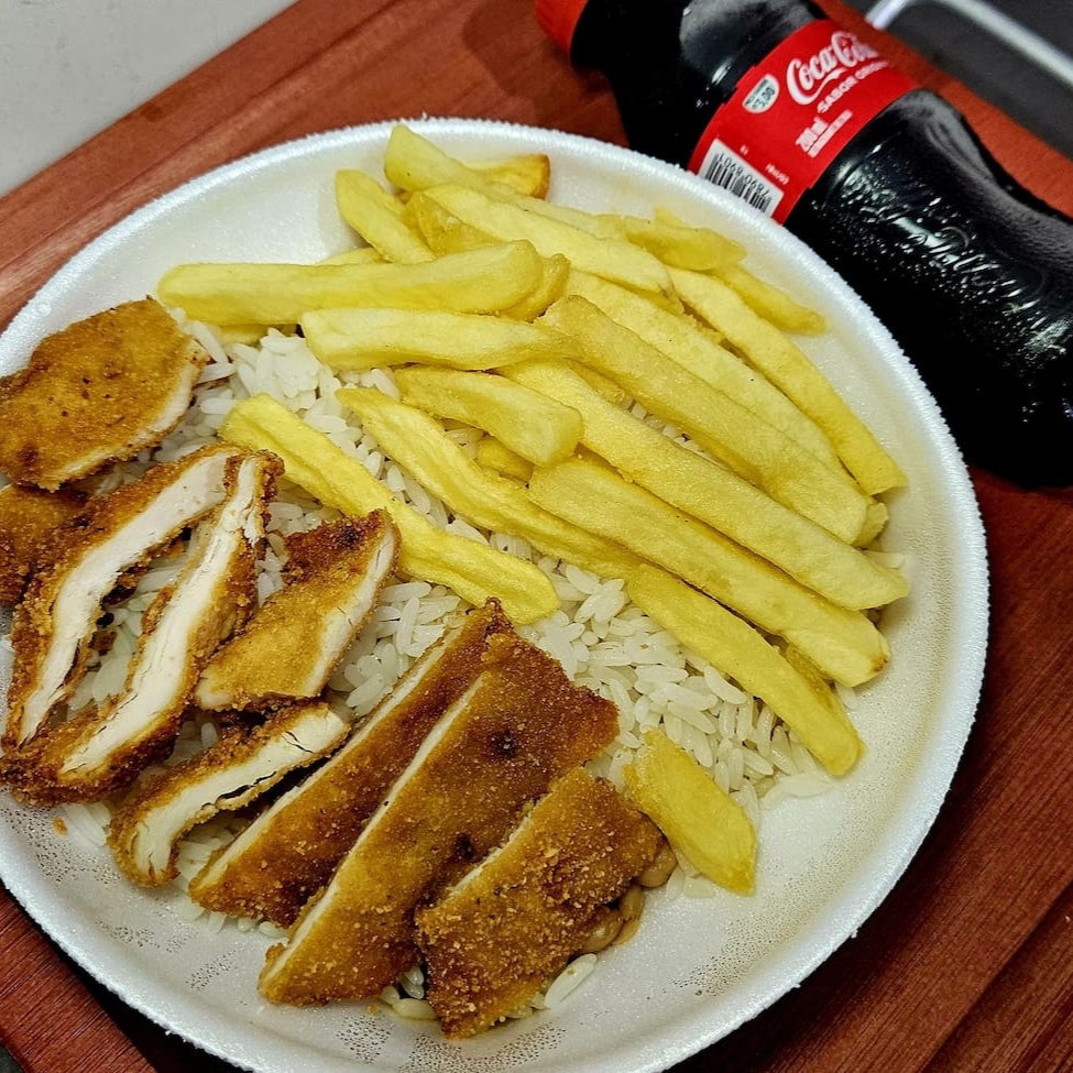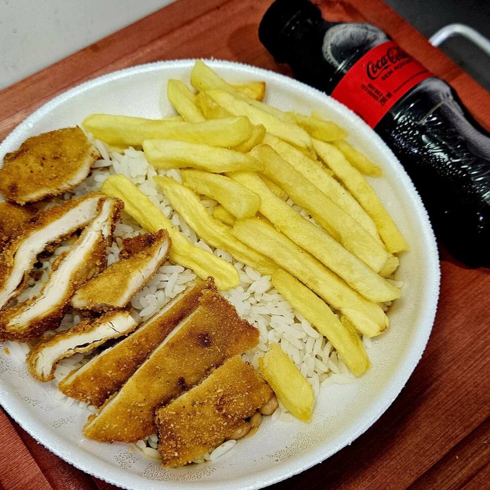 Frango Empanado em iscas acompanhado de arroz, feijão carioca, batata frita crocante + coca pet zero