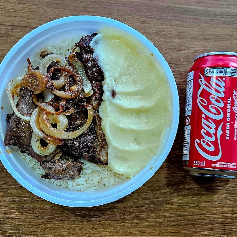 Contrafilé Acebolado acompanhado de arroz, feijão carioca e purê de batatas + Coca pet zero