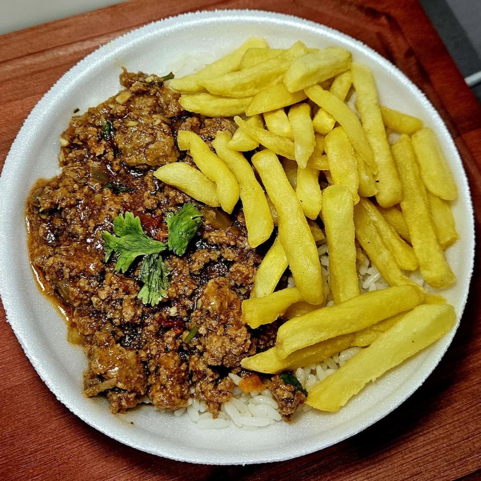 Carne Moída com batata frita acompanhada de arroz e feijão carioca