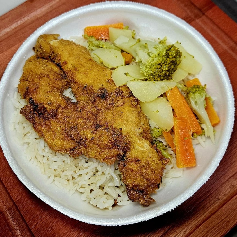 Frango empanado em iscas acompanhado de arroz, feijão carioca e mix de legumes