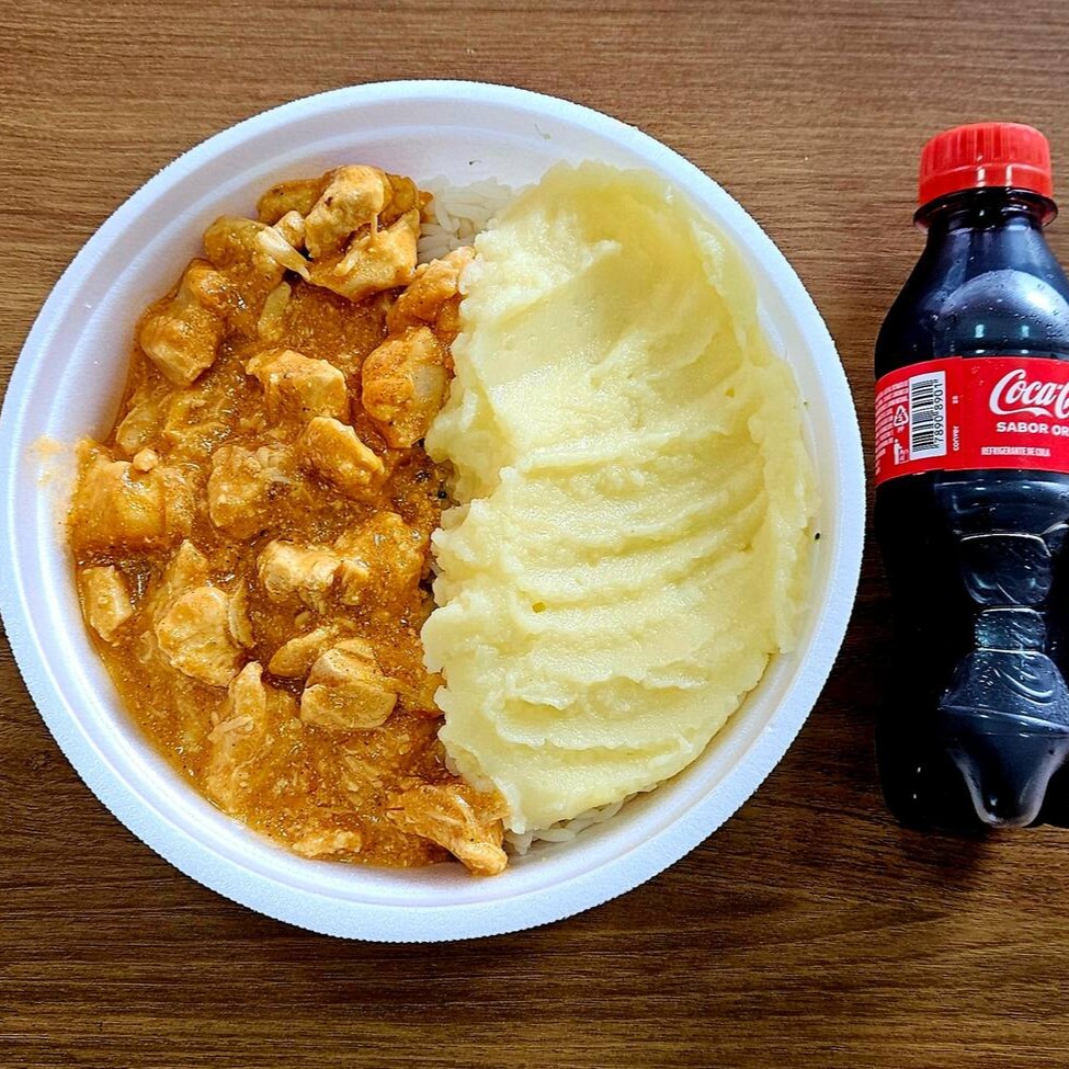 Strogonoff de frango acompanhado de arroz soltinho e purê de batatas caseiro + coca pet Original