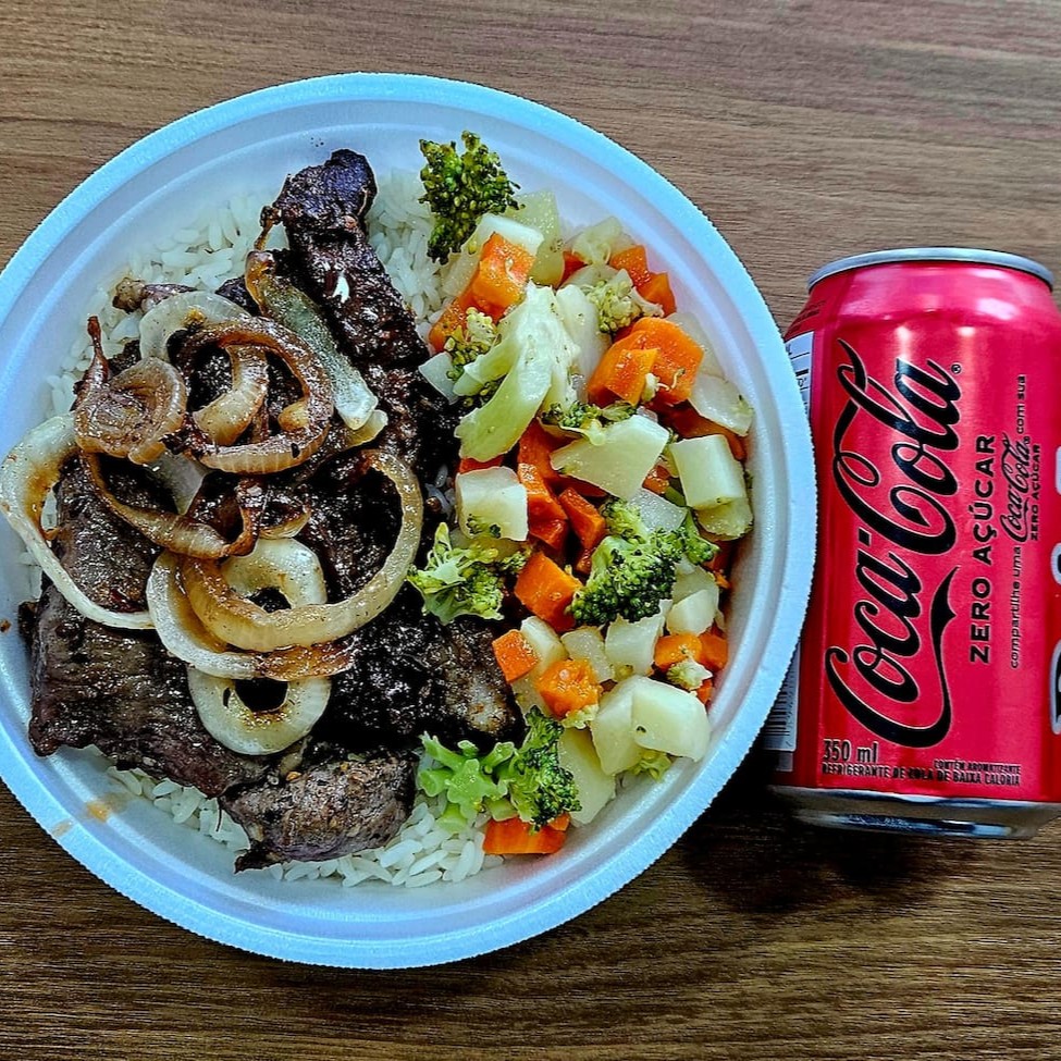 Contrafilé Acebolado acompanhado de arroz, feijão carioca e mix de legumes + Coca lata zero