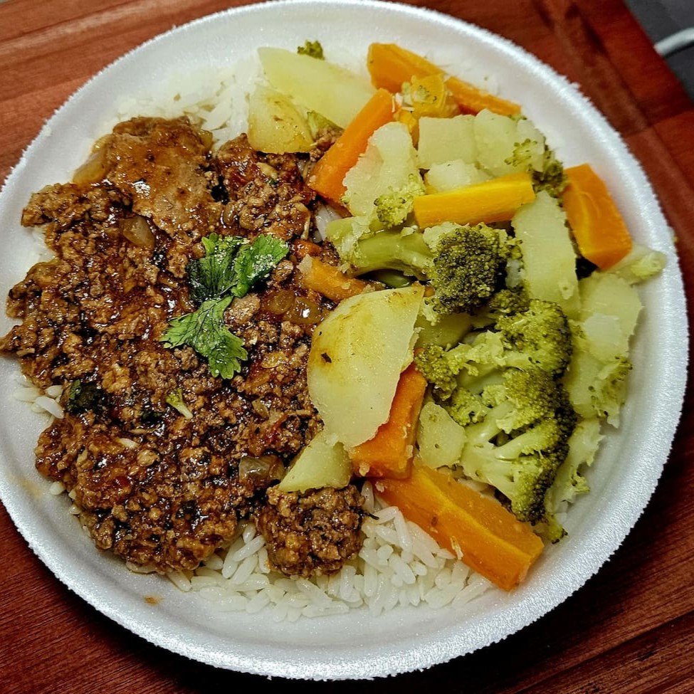 Carne Moída com mix de legumes acompanhada de arroz e feijão carioca