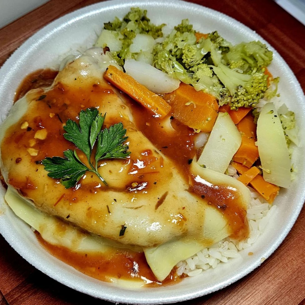 Frango Parmegiana com mix de legumes acompanhada de arroz soltinho