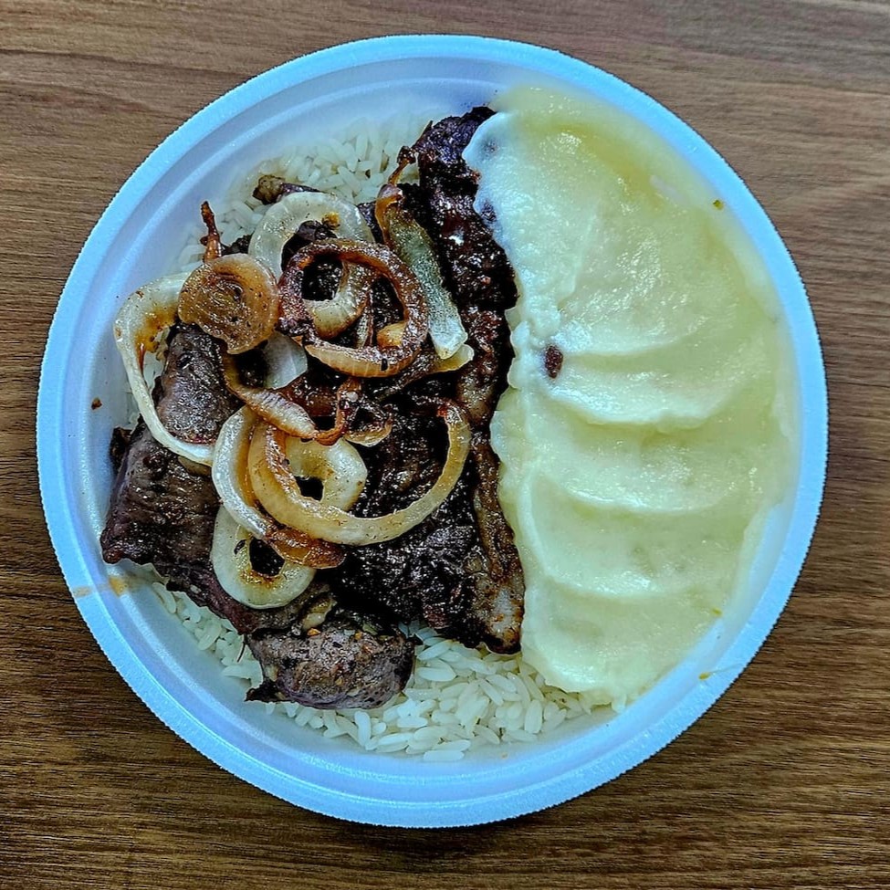 Contrafilé Acebolado acompanhado de arroz, feijão carioca e purê de batatas cremoso