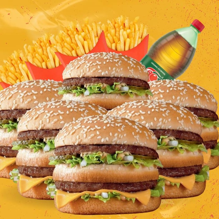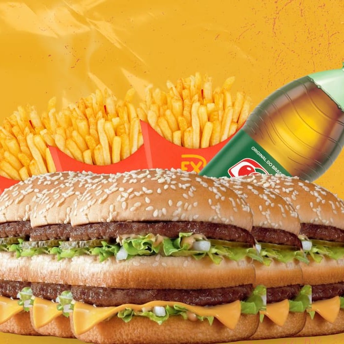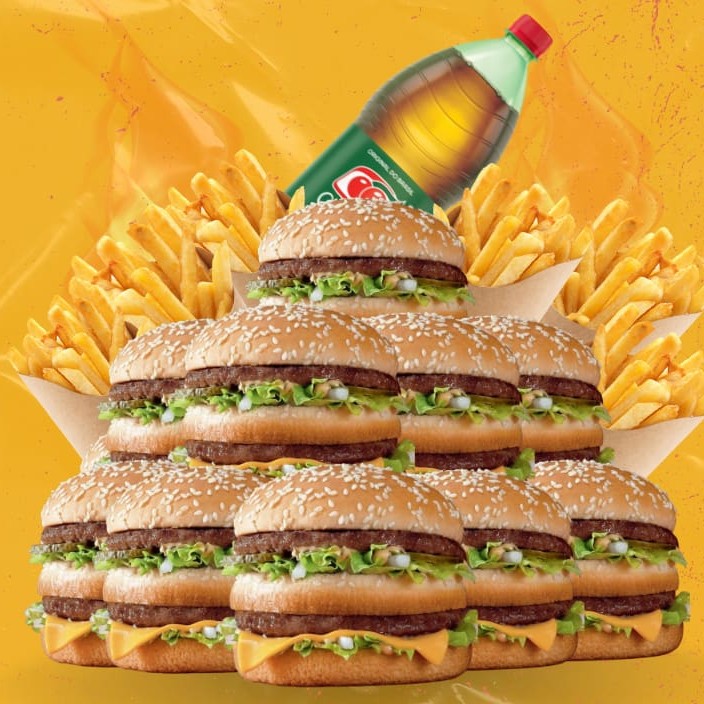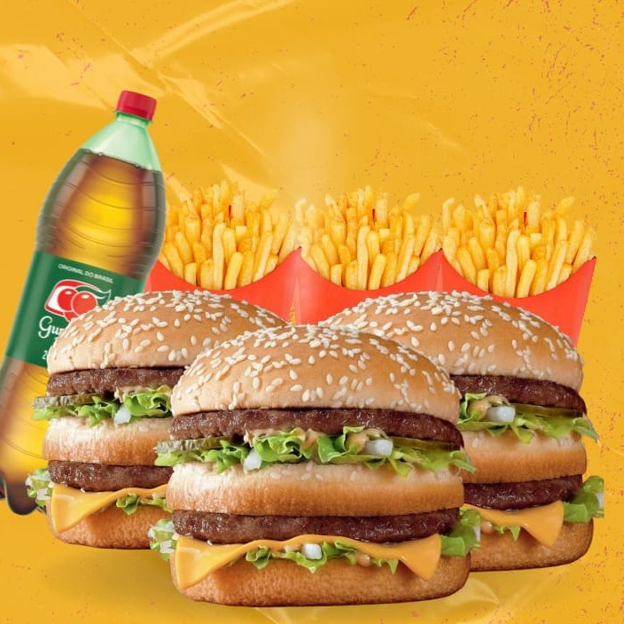 3 bigs(2 hambúrgueres de carne bovina, alface, queijo e molho especial + 3 batatas + refrigerante de 1,5 lt Refrigerante de acordo com a disponibiliade