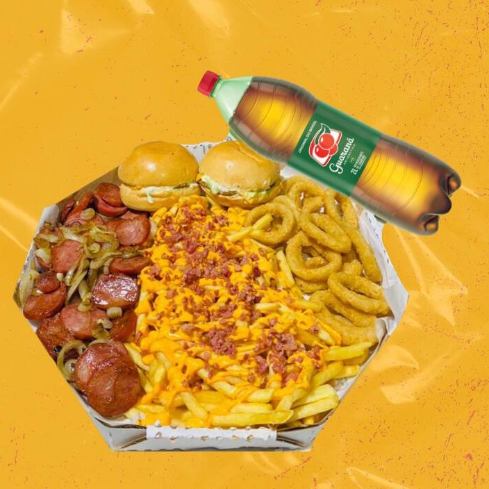 2 X salada + batata com cheddar e bacon + calabresa acebolada + 15 anéis de cebola Refrigerante de acordo com a disponibiliade