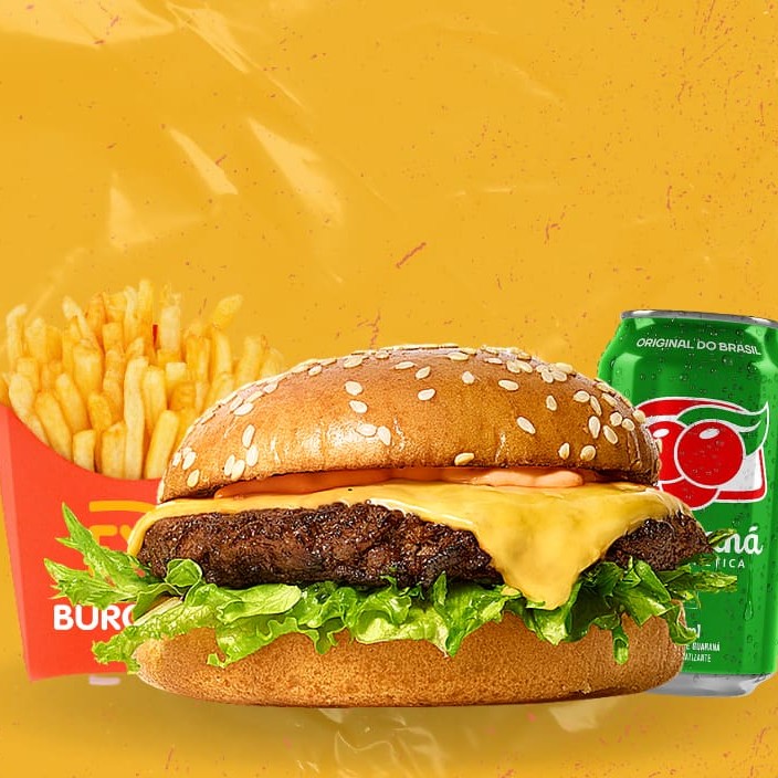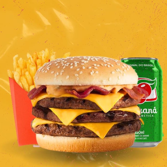 3 hambúrgueres de carne bovina, queijo, bacon e maionese Refrigerante de acordo com a disponibiliade