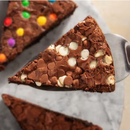 Brownie denso e úmido, com sabor intenso de chocolate e gotas que reforçam a textura. Imagem meramente ilustrativa.