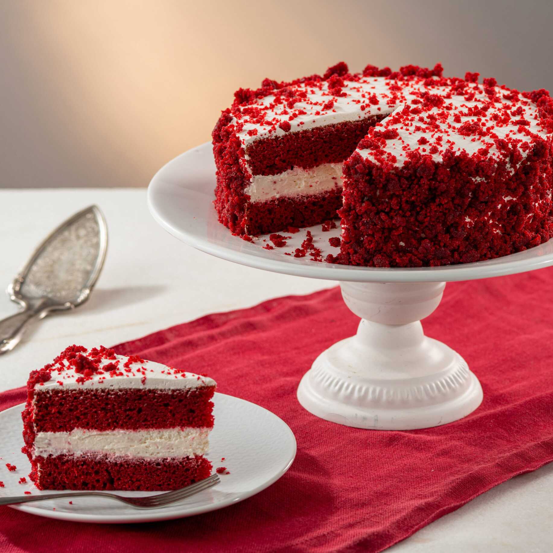 Bolo caseiro com massa vermelha aveludada, com leve toque de suco de limão, cacau e baunilha. Generosa camada de recheio e cobertura de cream cheese com baunilha, finalizado com farelos do maravilhoso bolo vermelho. Imagem meramente ilustrativa.