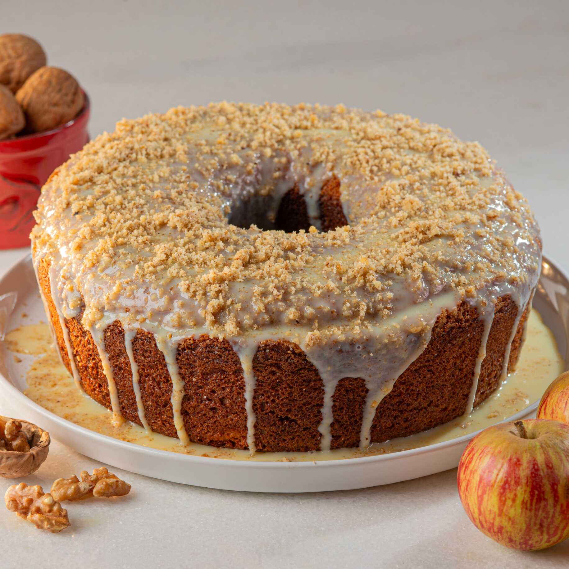 Nosso Delicioso Bolo de maçã caseiro, feito com suco e nozes trituradas na massa. Opção de cobertura: leite condensado e nozes trituradas. Imagem meramente ilustrativa.