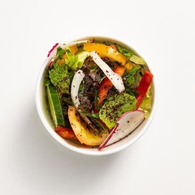 Salada com Alface, tomate, cebola, pepino, hortelã, rabanete, pimentão. Acompanha Molho especial de romã e pão torrado.