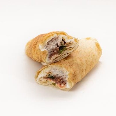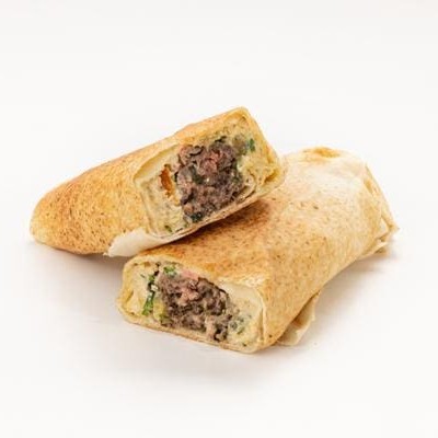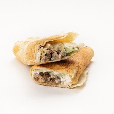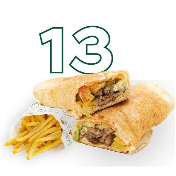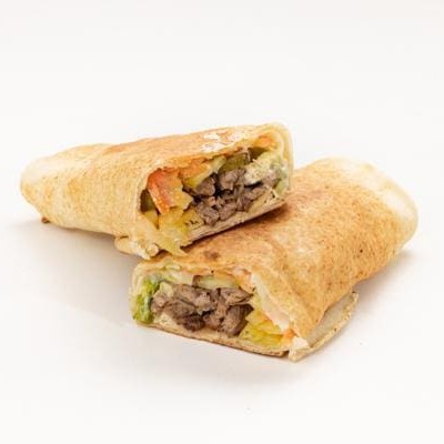 Tiras de carne temperadas com especiarias, pasta de alho, repolho com maionese especial da casa, batata frita, tomate e picles prensados na chapa no pão libanês.