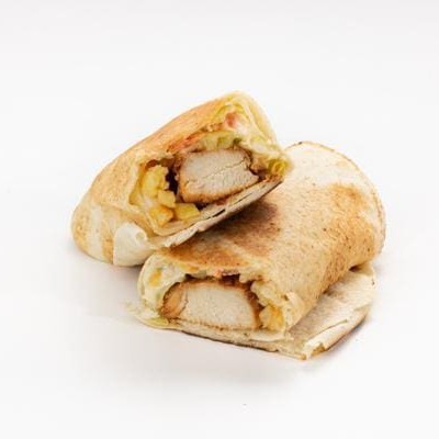 Cubos de frango temperados com especiarias, pasta de alho, repolho com maionese especial da casa, tomate e batata frita prensados na chapa no pão libanês.