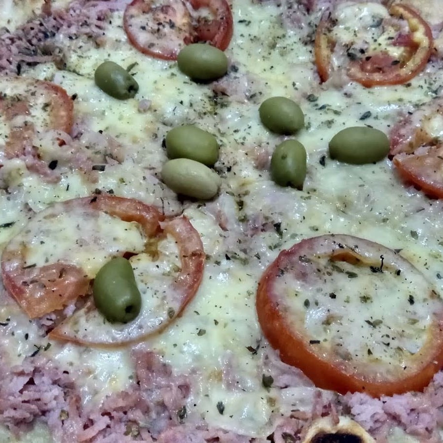 Molho, presunto, muçarela, tomate e azeitonas
