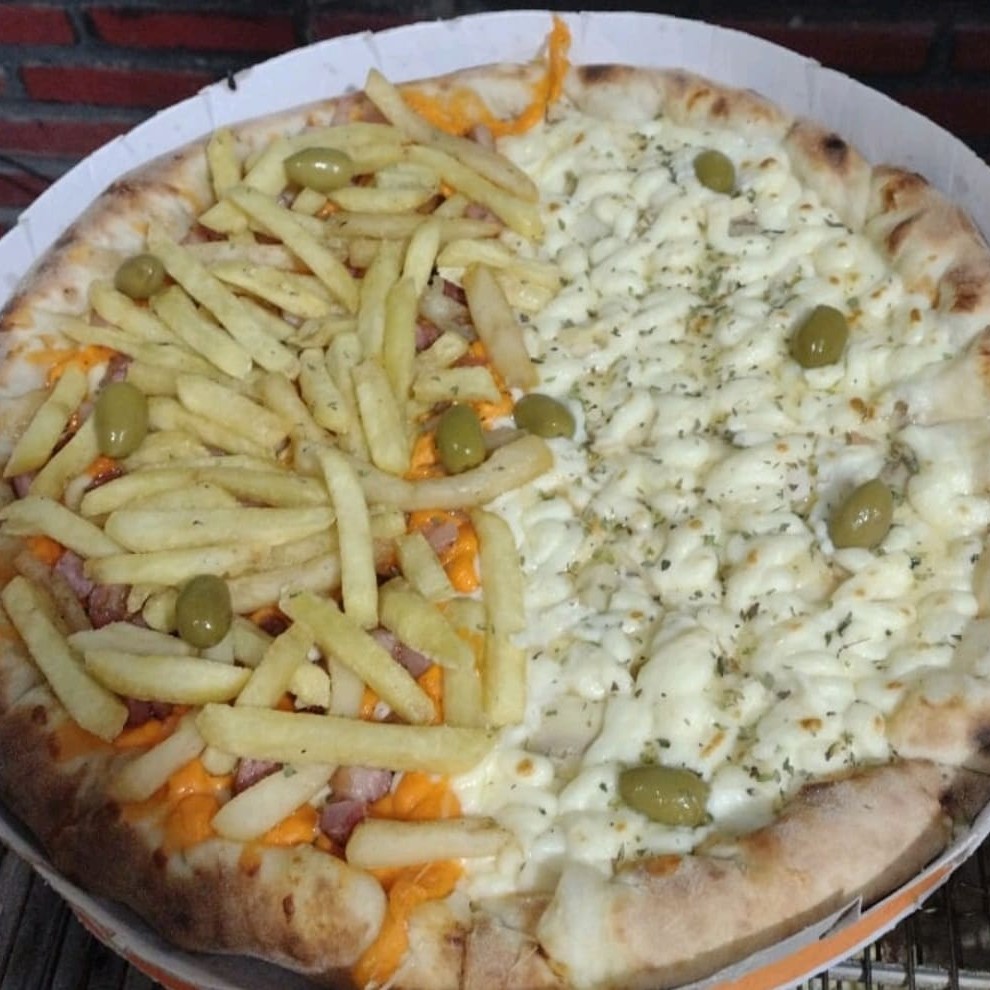 Pizza meia batata frita com cheddar e meia 4 queijos ( muçarela, parmesão, provolone e Catupiry Original
