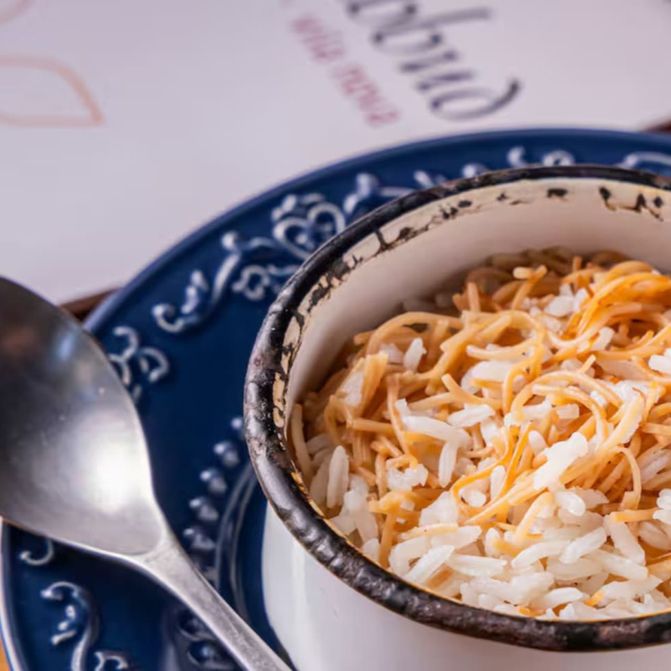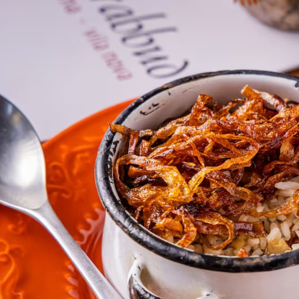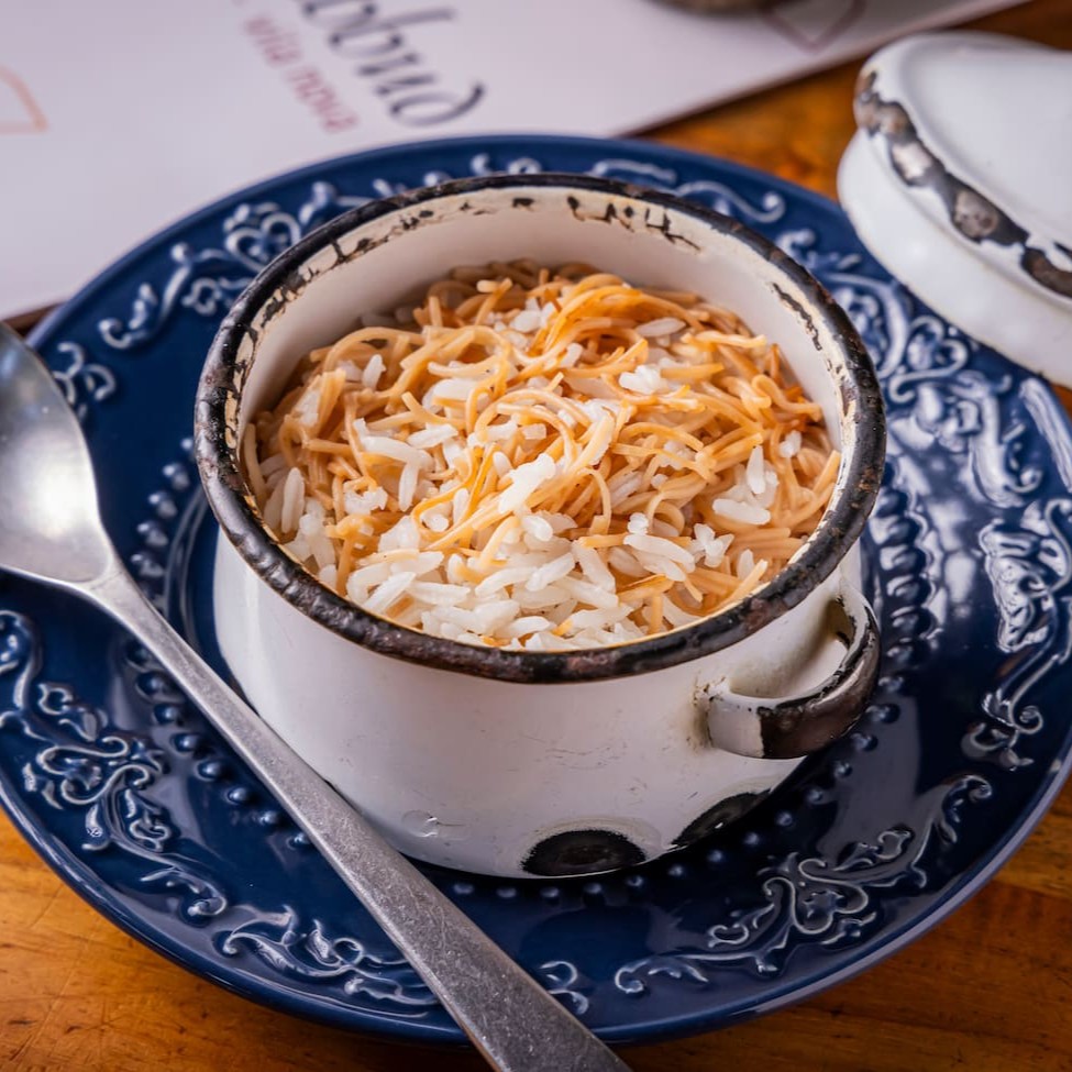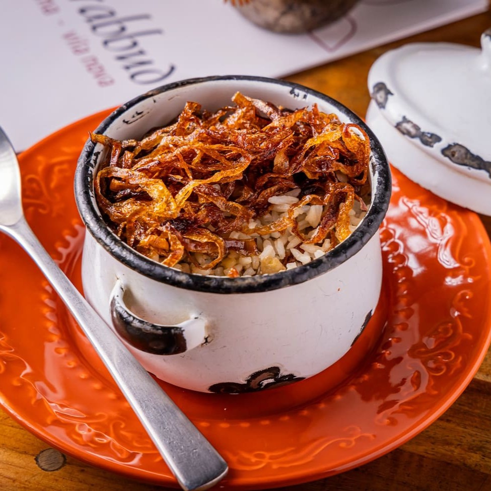 Desfrute de uma deliciosa combinação de arroz branco suavemente cozido com lentilhas nutritivas, tudo regado com um toque de azeite de oliva extra virgem. Para completar, uma generosa cobertura de cebolas fritas crocantes, douradas à perfeição. Este prato é uma explosão de sabores e texturas que proporcionam uma experiência culinária única. É a escolha perfeita para quem busca uma refeição saboros