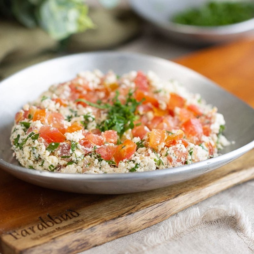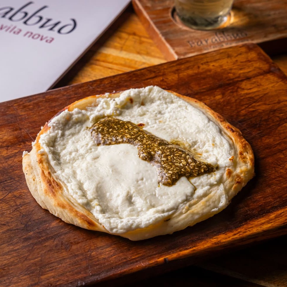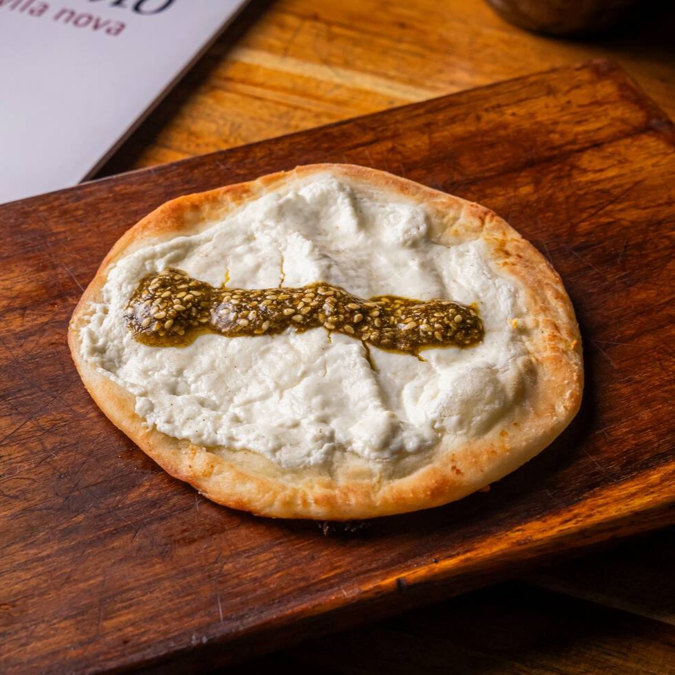 Ricota desidratada, passada no zathar, temperada com azeite virgem, salsa e cebola picante.