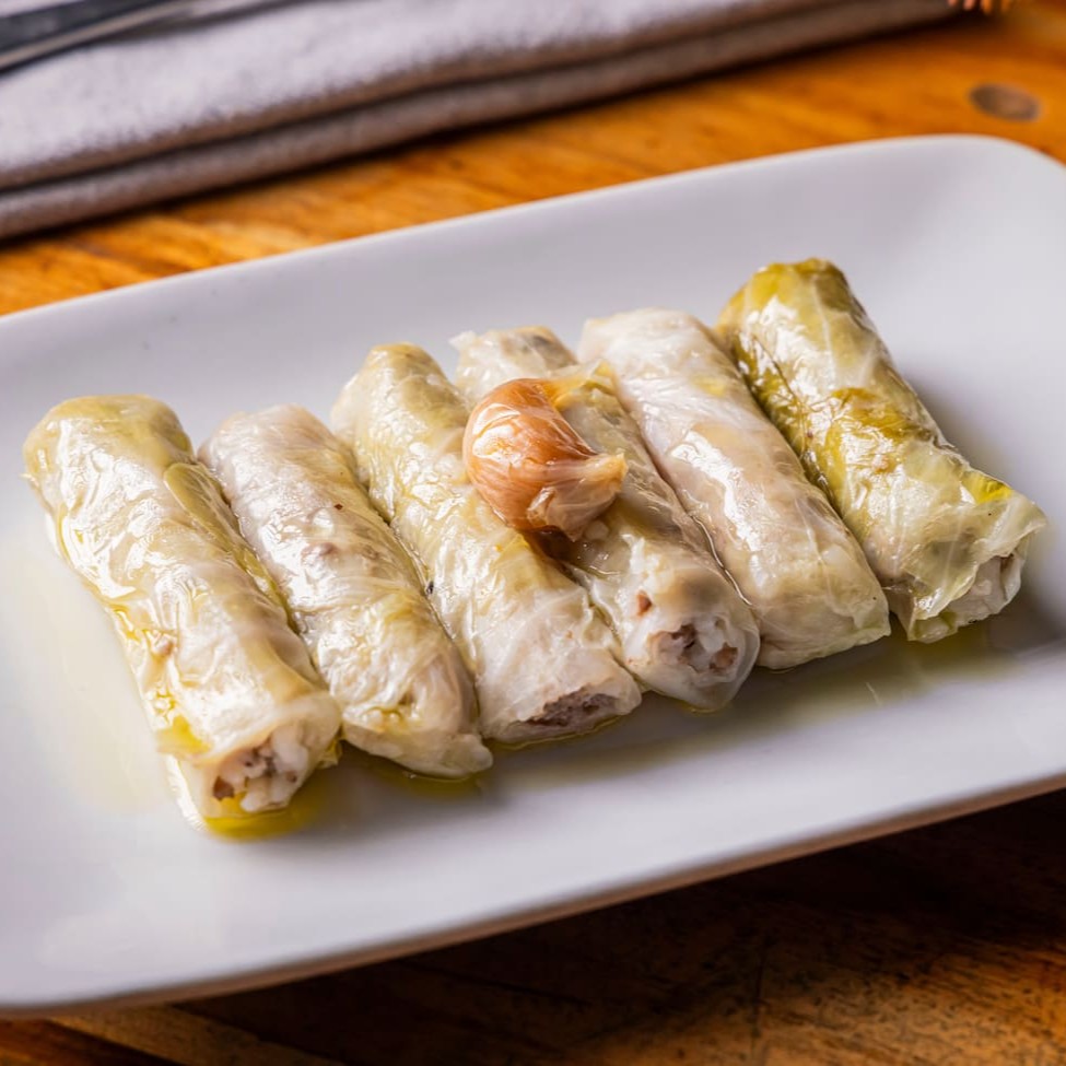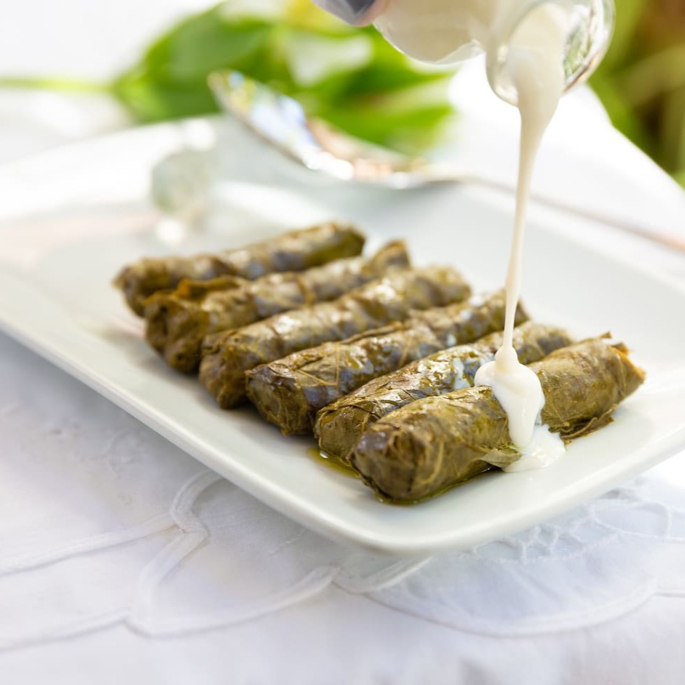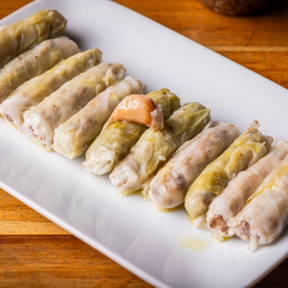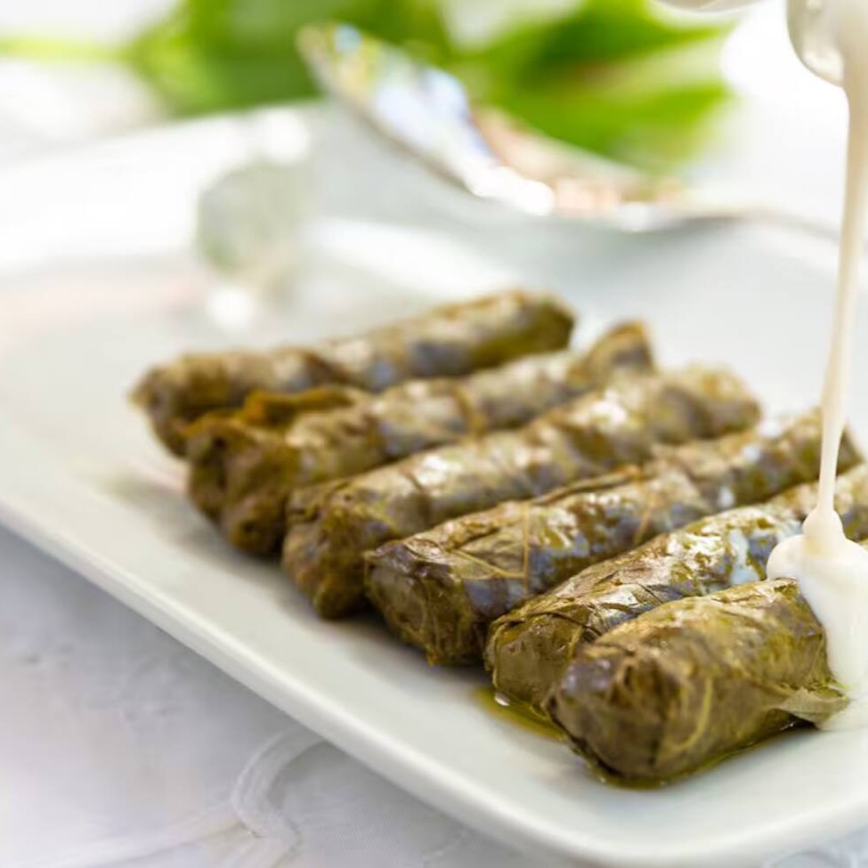 Folhas de uva, com delicioso recheio de arroz e carne moída selecionada. Acompanha Coalhada Fresca