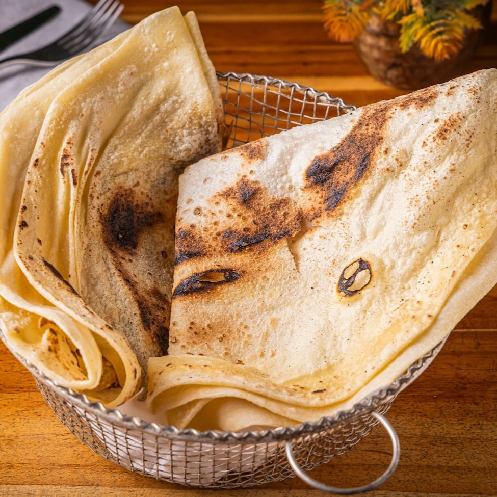Pão saj enrolado com coalhada seca e vinagrete, acompanha batata randa ou salada de rúcula.