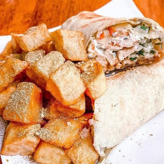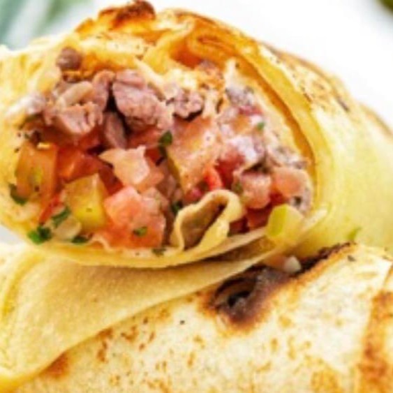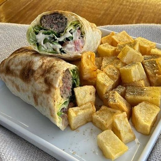 Pão saj enrolado com iscas de filé Mignon salteados no azeite e cebola, coalhada seca, molho vinagrete com sumac. Acompanhado de batata randa ou salada de rúcula.