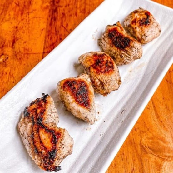 Pedaços de filé de frango selecionados, no espeto e assados na chapa, acompanha molho vinagrete.