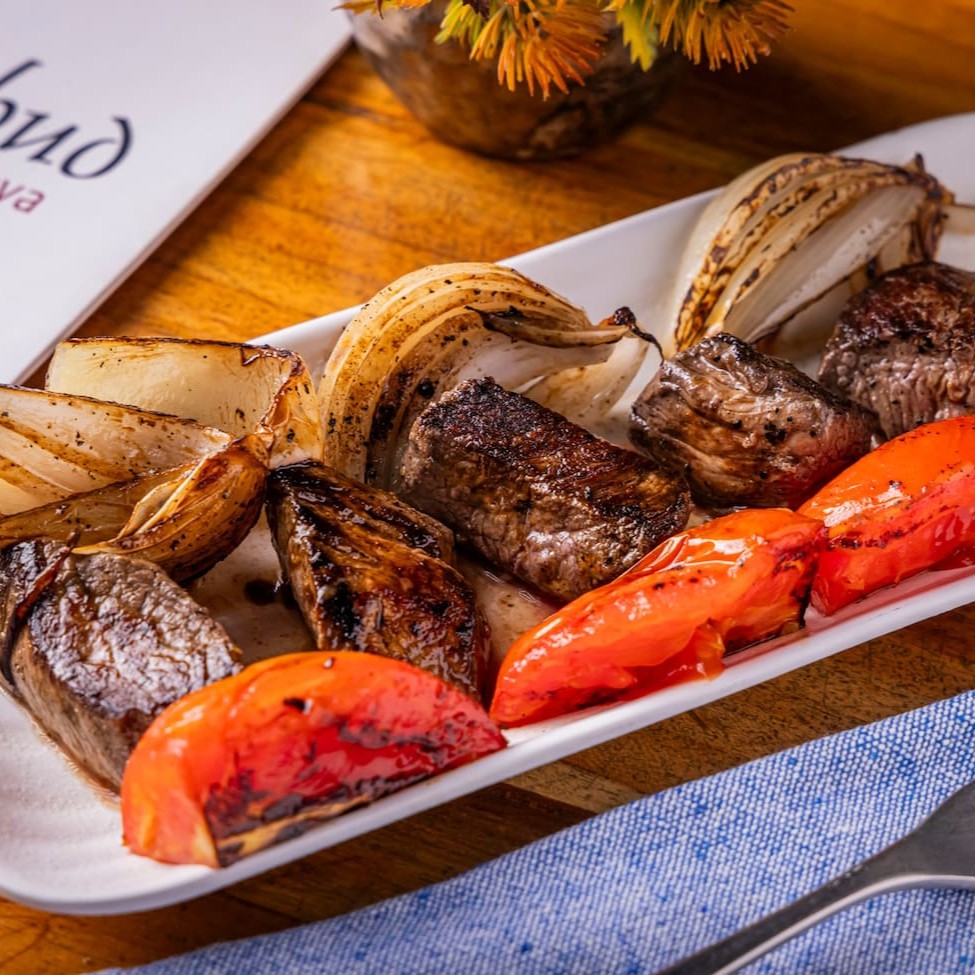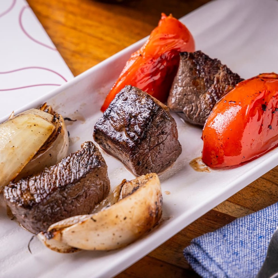 Tenros pedaços de filé mignon selecionados, no espeto, assados na chapa. Você poderá escolher o tempero Vinagrete ou Oriental (Tomate e cebola, conforme foto). Escolha nas observações.