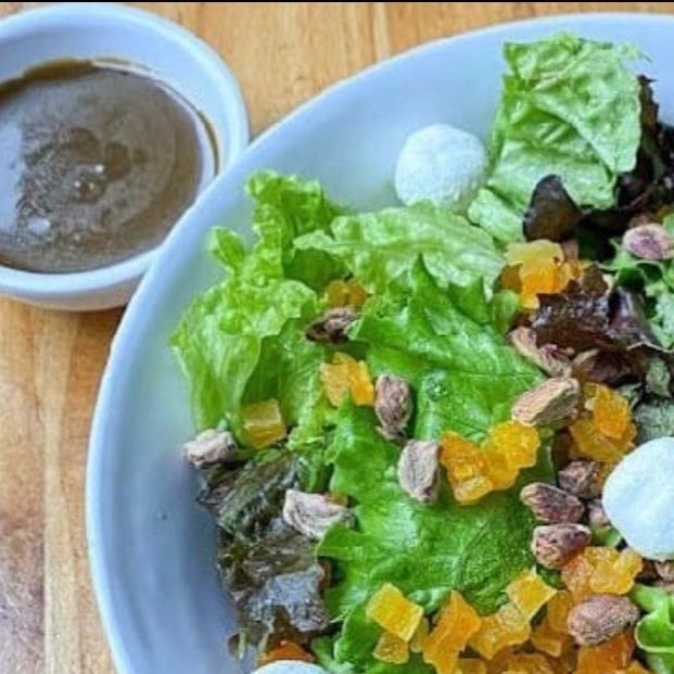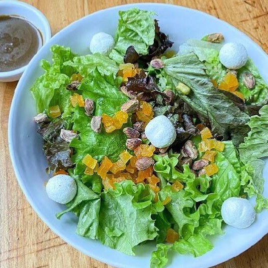 Nossa salada fresquinha de folhas verdes com queijo de cabra, salpicado de damascos secos, amêndoas com mel e molho balsâmico.
