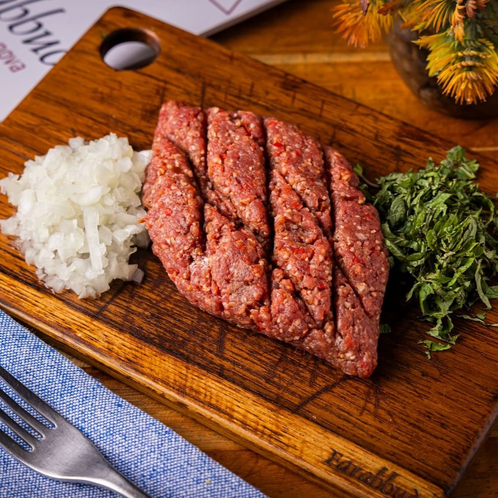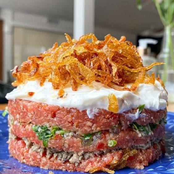 Três camadas de kibe cru, uma de carne moída, uma de tabule, finalizada com coalhada seca e cebola dourada no azeite.