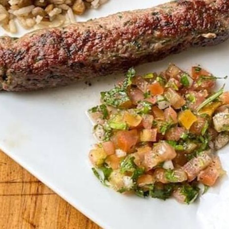 Espeto de carne moída selecionada, acrescido de salsinha, assado na chapa com especiarias árabes, acompanha molho vinagrete.