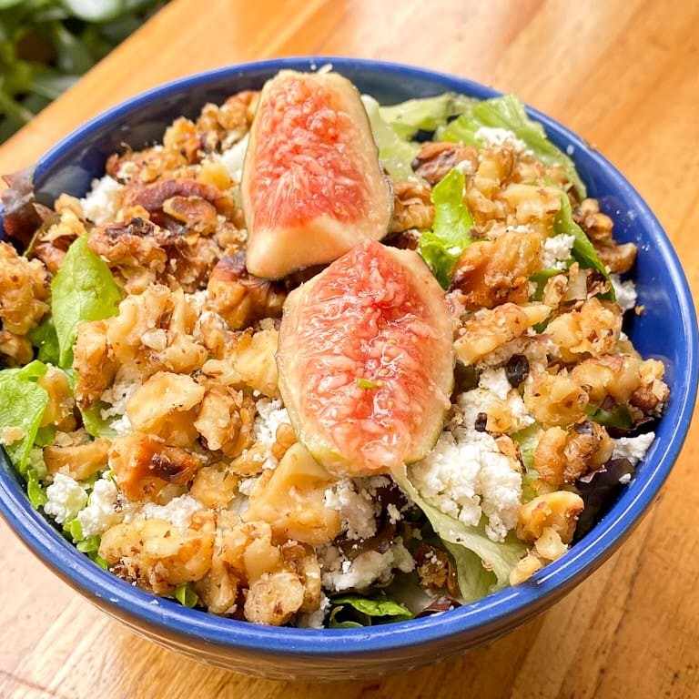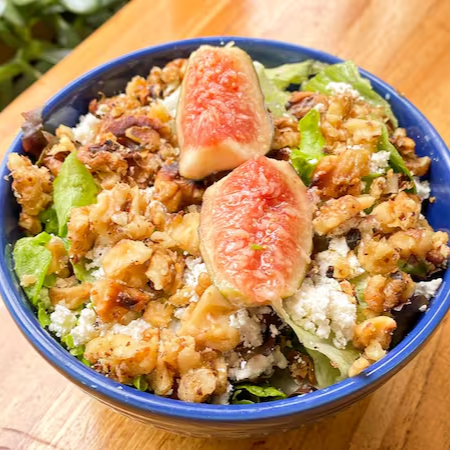 Mix de folhas verdes temperadas com molho a base de mel e redução de balsâmico, pedaços de chancliche, fruta selecionada e nozes torradas.