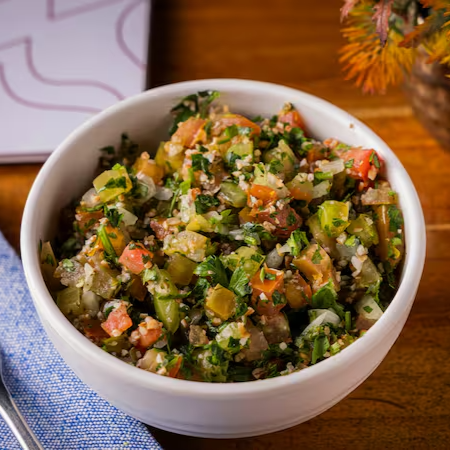 A simplicidade do tomate, pepino, salsinha e da alface americana, cortados na ponta da faca, temperados com limão, finalizados com pão árabe torrado.