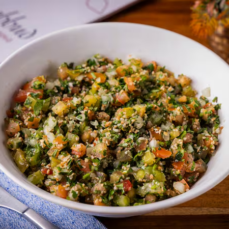 Apresentamos o irresistível Kibe Cru de Salmão, uma especialidade da categoria 'Kibes'. Este prato é uma combinação sublime de tartar de salmão de qualidade superior, meticulosamente temperado com uma seleção harmoniosa de especiarias finas. A fresca salsinha adiciona um toque de verde e acentua os sabores, enquanto o limão dá um toque cítrico essencial que realça a riqueza do salmão.