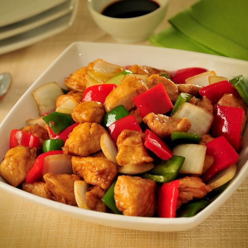Delicioso e suculento Frango Xadrez,Dos mais tradicionais da cozinha oriental, este prato combina: cubinhos de frango com pimentões verde e vermelho, cebola e amendoim (opcional)