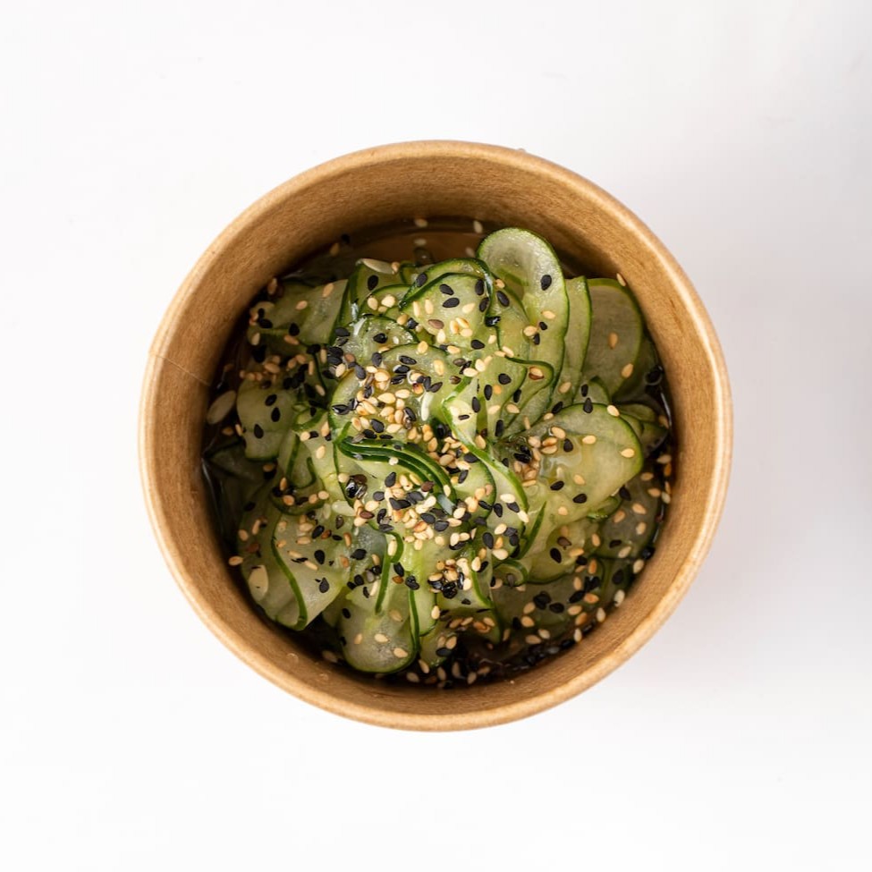 Salada de pepino japonês finalizada com gergelim tostado e um toque de óleo de gergelim.