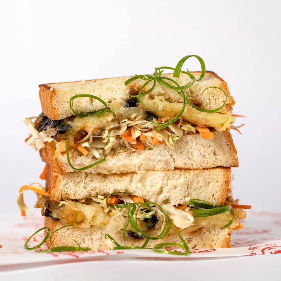 Tempura de berinjela (75g) com molho de missô, saladinha de repolho e cenoura no pão Hokkaido (fermentação 100% natural).