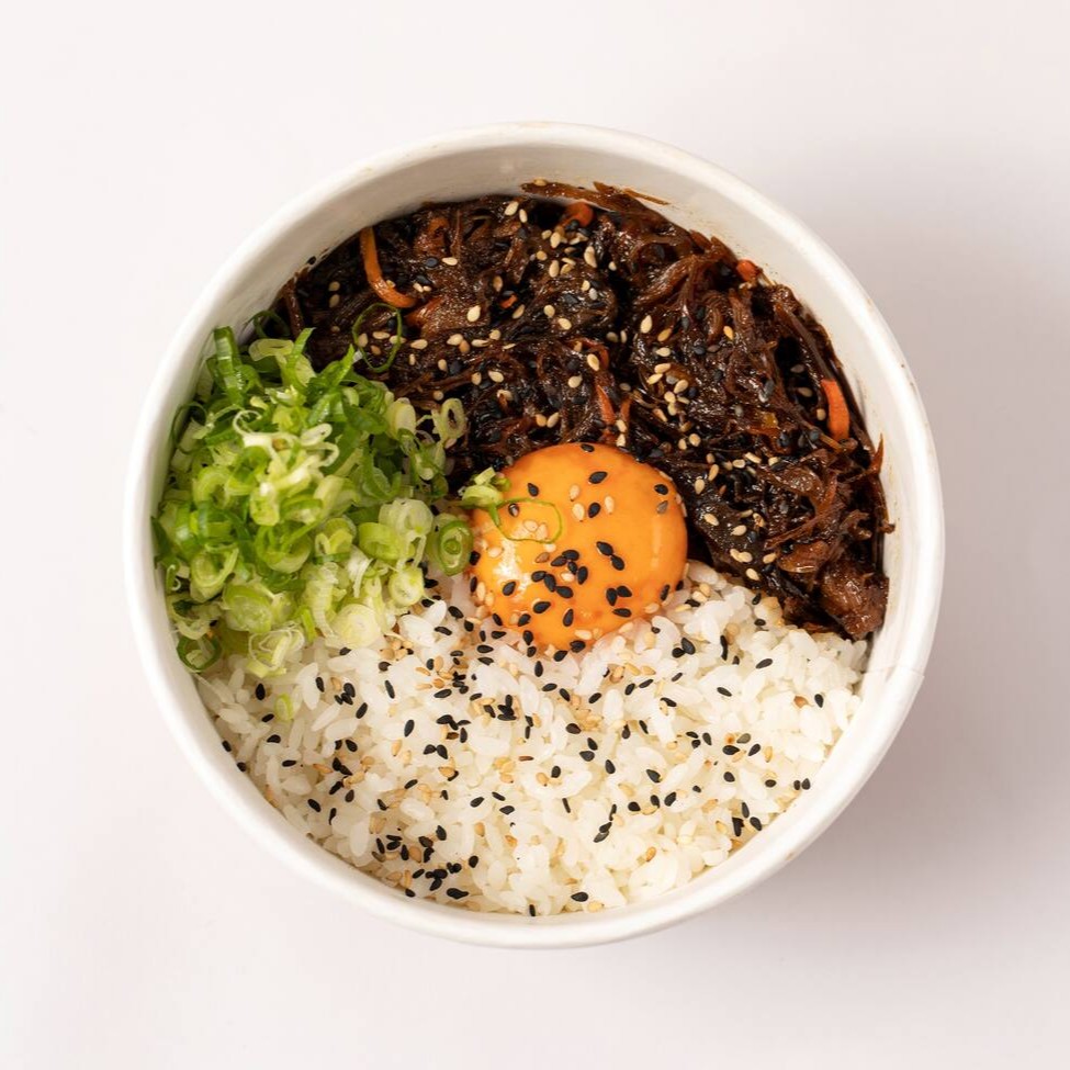 Costela de boi angus desfiada (120g), marinada (feita na casa levemente adocicada) e finalizada na Wok com cenoura Julienne. Acompanha Gohan, finalizado com gergelim tostado, cebolinha finamente cortada e gema curada. Obs: gema vem a parte
