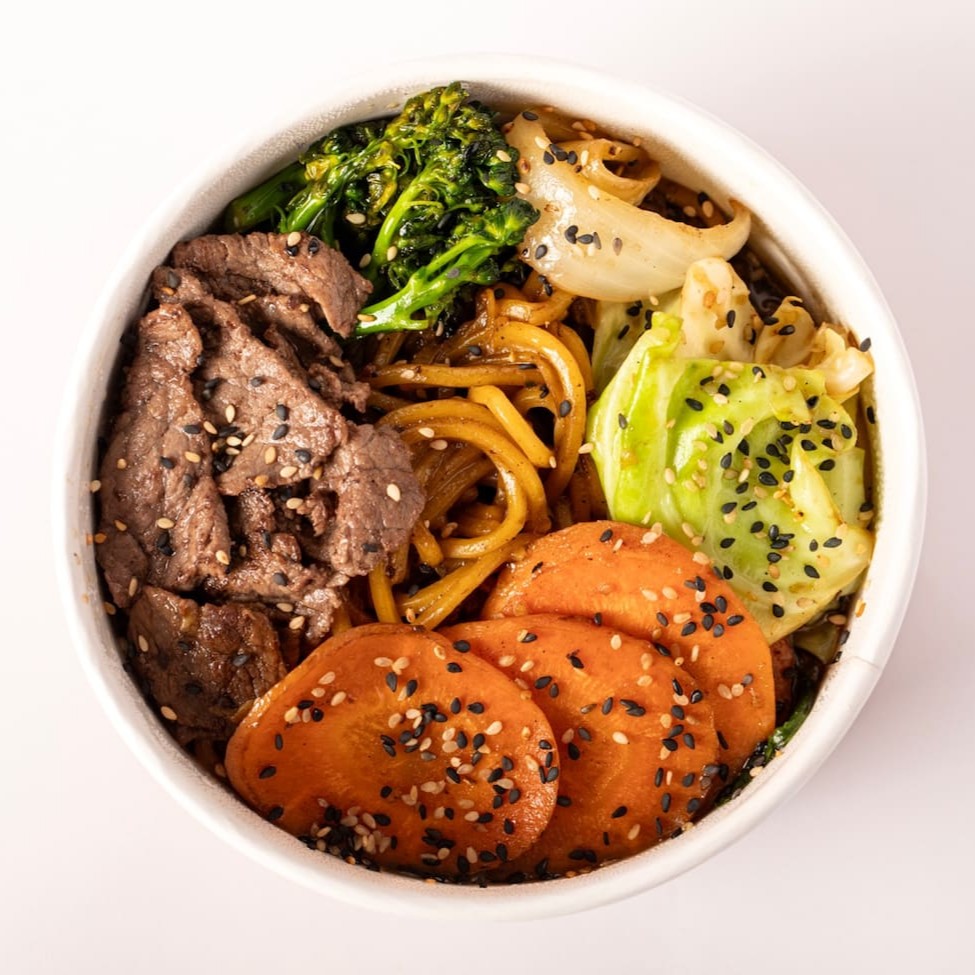 Noodles com Wagyu (150g) cortado em finas fatias, salteados com cenoura, cebola, repolho e brocólis no molho especial Fat Buddha. (base shoyu)
