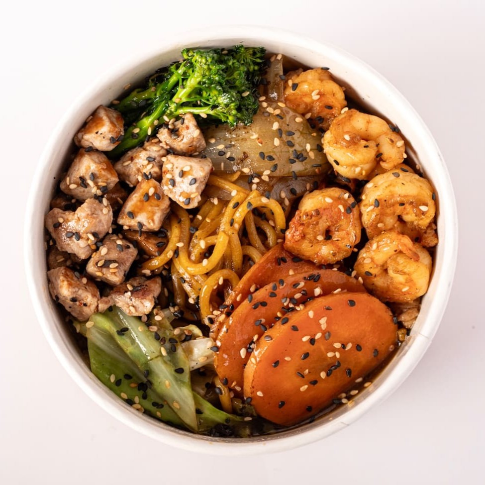 Noodles com Camarão (125g) e filé mignon suino (80g) salteados com cenoura, cebola, repolho e brocolis no molho especial Fat Buddha. (base shoyu)